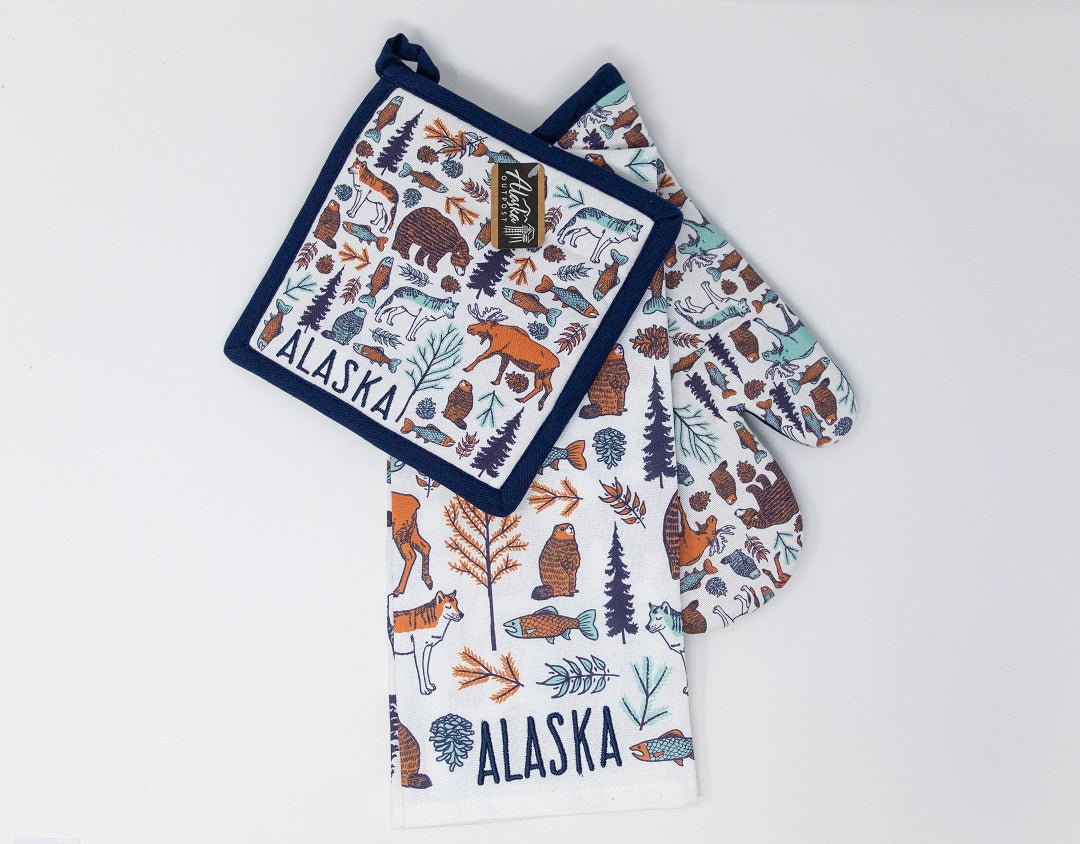Bring the wild beauty of Alaska into your kitchen with this 3-Piece Patternalia Kitchen Set. Featuring charming illustrations of Alaskan wildlife — including moose, bears, wolves, and foxes — surrounded by forest trees and pinecones, this matching set captures the rustic charm of the Last Frontier. The earthy tones and intricate patterns make it both functional and decorative, perfect for any cabin, lodge, or cozy home kitchen.