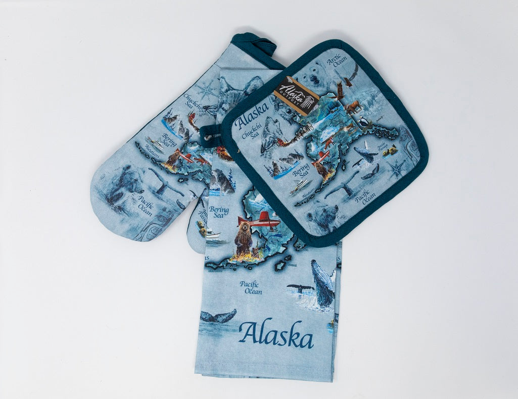 The set includes a kitchen towel, oven mitt, and pot holder, all crafted from durable, heat-resistant materials in soothing blue tones that evoke Alaska’s ocean and sky. Perfect for everyday use or as a thoughtful gift, this set brings both function and Alaskan flair to your home.