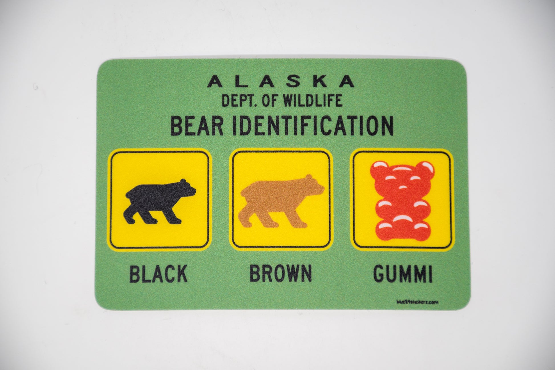 Design: “Alaska Dept. of Wildlife Bear Identification” with black, brown, and gummy bear icons