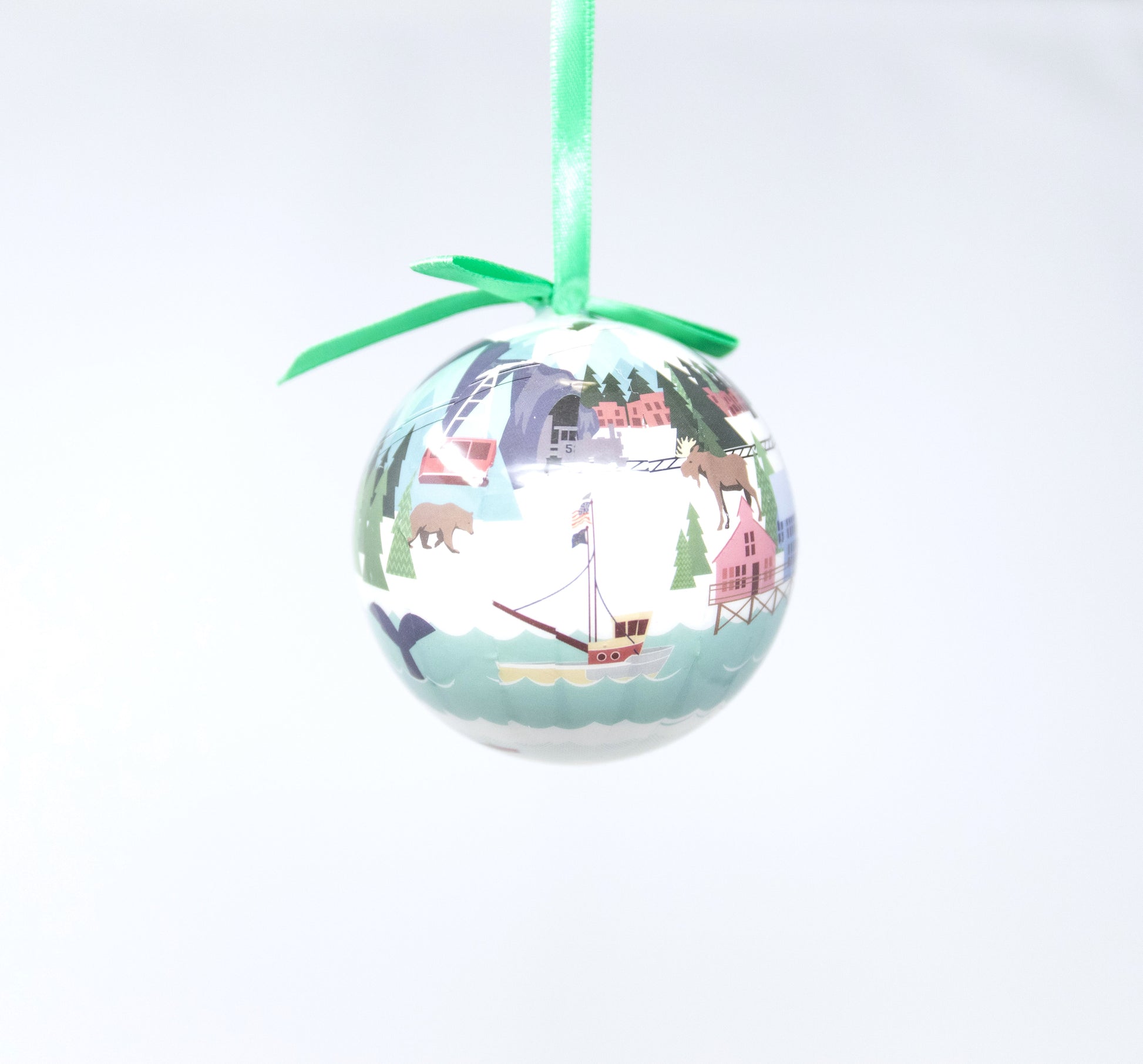 Capture the charm of Alaska’s coastal life with this beautifully illustrated Small World Ball Ornament. Featuring a whimsical wraparound scene of fishing boats, wildlife, forests, and seaside cabins, this ornament brings the beauty and adventure of the Great North to your holiday décor.